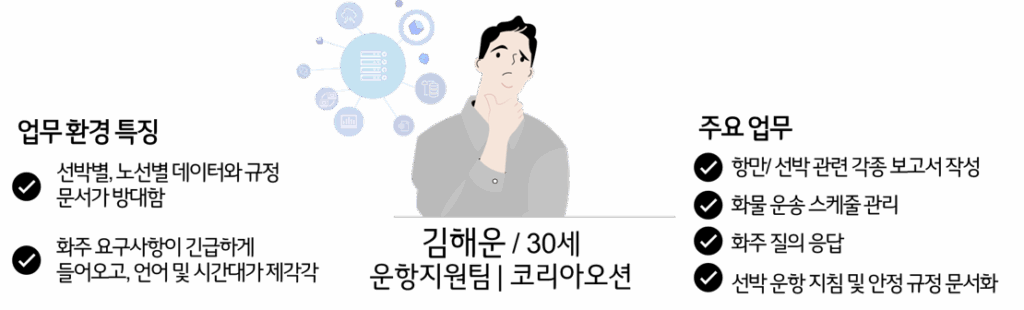 김해운 대리는 평소 항만·선박 관련 보고서를 작성하고, 화물 운송 스케줄을 관리하며, 화주들의 질의에 응답하는 업무를 맡고 있습니다. 특히 선박 운항 지침과 안전 규정과 같은 문서를 정리할 때는 방대한 규정집과 과거 자료를 일일이 확인해야 해서 많은 시간이 소요되었습니다.