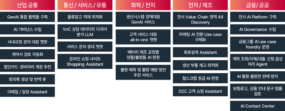 이미 여러 산업에서 전사 차원의 AX 전략 수립부터 개별 서비스의 AI 혁신까지 다양한 성과가 나타나고 있습니다. 단순한 시범 도입을 넘어, 기업의 핵심 의사결정과 운영 전반을 AI 중심으로 재편하면서 눈에 띄는 변화를 확인할 수 있습니다.